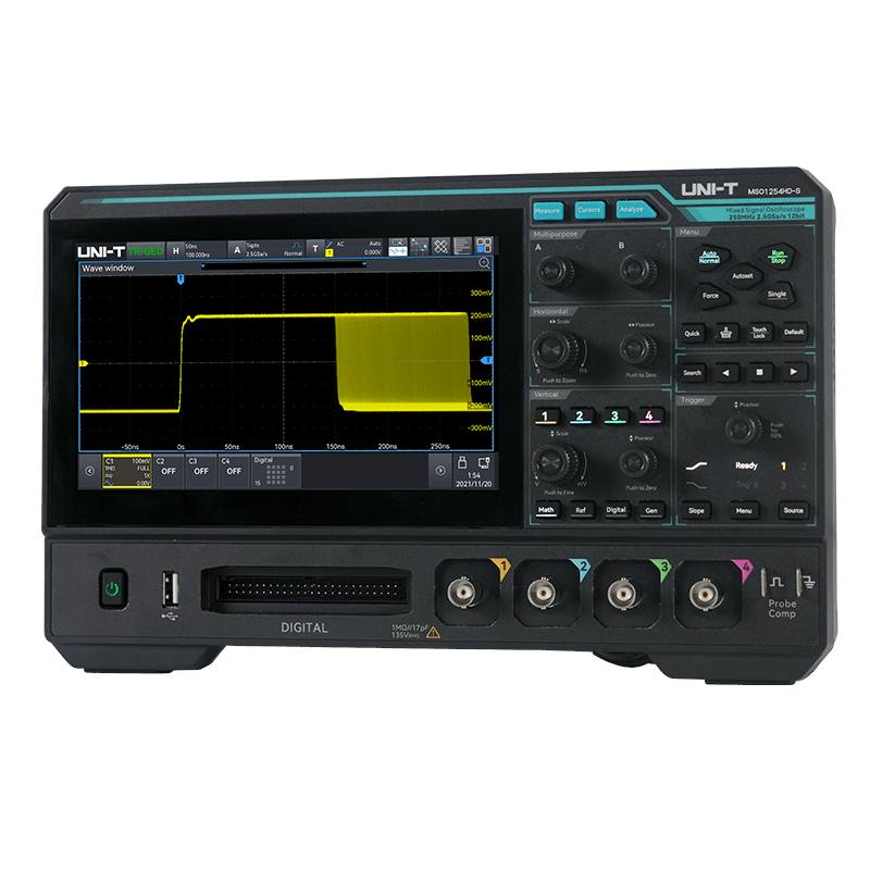 MSO1000HD series high-resolution oscilloscope has the maximum bandwidth of 250 MHz, the maximum sample rate of 2.5 GSa/s, and is equipped with 4 analog channels and 16 digital channels, with the memory depth of up to 100 Mpts. MSO1000HD series adopts exclusive Ultra Phosphor 3.0 technology, achieving the waveform capture rate of up to 200,000 wfms/s, with 256 levels of gray temperature colors, and features an innovative digital trigger system with high trigger sensitivity and low jitter