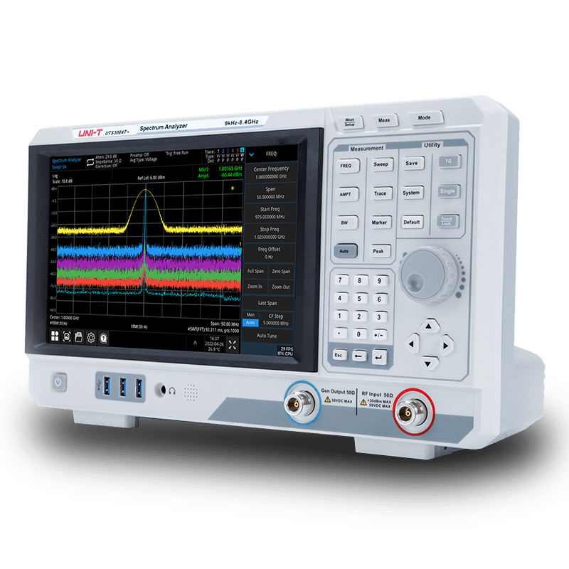 The UTS3000T+ series spectrum analyzer can measure frequencies up to 8.4GHz. It is a spectrum analyzer with wide frequency band coverage and superior performance. The series adopts mature all digital IF technology. It provides a variety of analysis functions, and up to 40,001 scanning points , providing better help for your frequency domain analysis. This series of spectrum adopts a 10.1 inch large touch screen, which will bring you a better use experience. The UTS3000T+ series can be applied to functional/terminal/quality inspection tests in the electronics manufacturing industry, as well as wireless communication measurement, RF microwave courses, electromagnetic compatibility pre-scan, semiconductor measurement and many other application scenarios.